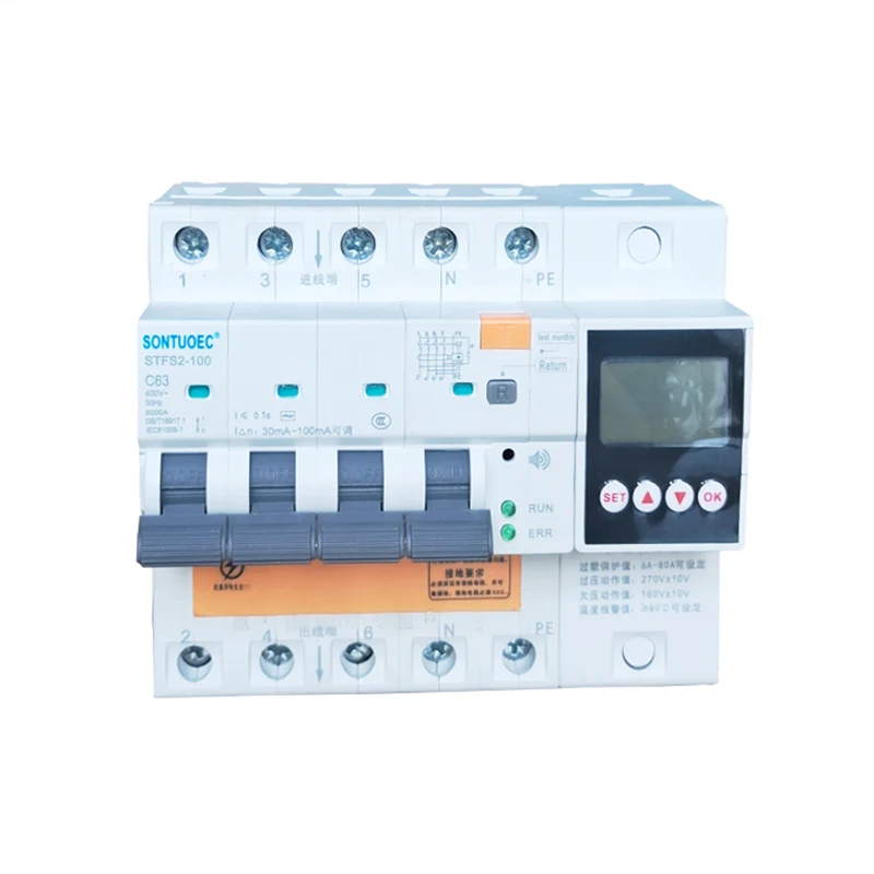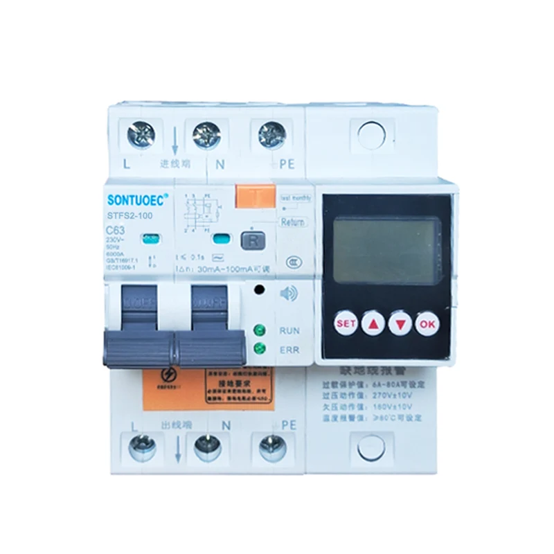 STSF2-100 100A 2P 4P RCBO multifuncional es adecuado para AC 50/60Hz, clasificado en un circuito con un voltaje de 230V-400V y una corriente nominal de 100A, cuando el apersono está electrocutado o las fugas de la cuadrícula de alimentación. Cuando la fuga, la sobretensión y la subtensión alcanzan los valores establecidos, el interruptor de circuito de corriente residual puede operar rápidamente en un período de tiempo muy corto corta rápidamente la fuente de alimentación. Cuando la temperatura de monitoreo del disyuntor de corriente residual alcanza el valor establecido, el cable de tierra de monitoreo no está conectado. Cuando está conectado, el producto emite un sonido de alarma para proteger la seguridad del personal y el equipo eléctrico, y puede evitar Evite el daño al equipo causado por una sobretensión en la red eléctrica. Tiene sobrecarga, cortocircuito, fuga, sobrevolteas de sobretensión y funciones de protección de sobretemperatura también se pueden usar para encender y apagar intermitentemente los dispositivos eléctricos en circunstancias normales Circuitos de iluminación, especialmente adecuados para sistemas de distribución de iluminación industrial y comercial. El producto tiene un pequeño volumen, una estructura compacta y una mejor efectividad que otros productos similares. Tiene una hermosa apariencia, La alta capacidad de ruptura lo convierte en una buena opción para la distribución de energía del hogar. Este producto cumple con los estándares GB/T 16917.1 e IEC 61009-1 y ha obtenido la certificación CE.